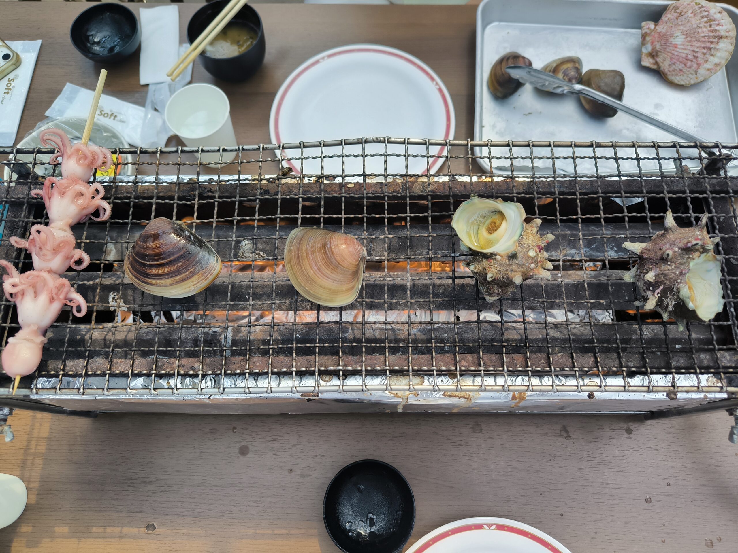 テーブルの上の網で、サザエやハマグリを焼いてみましょう。